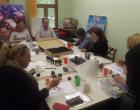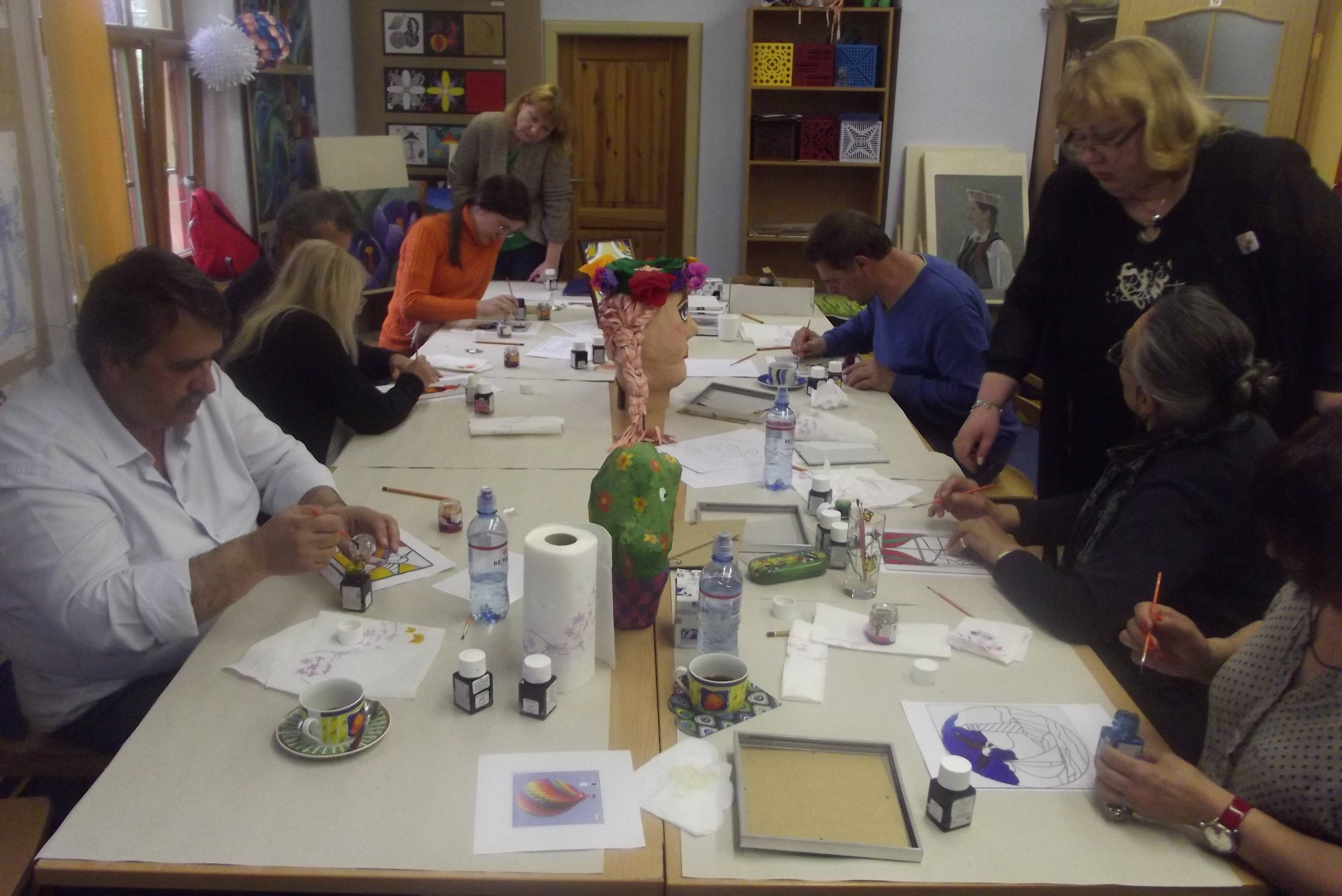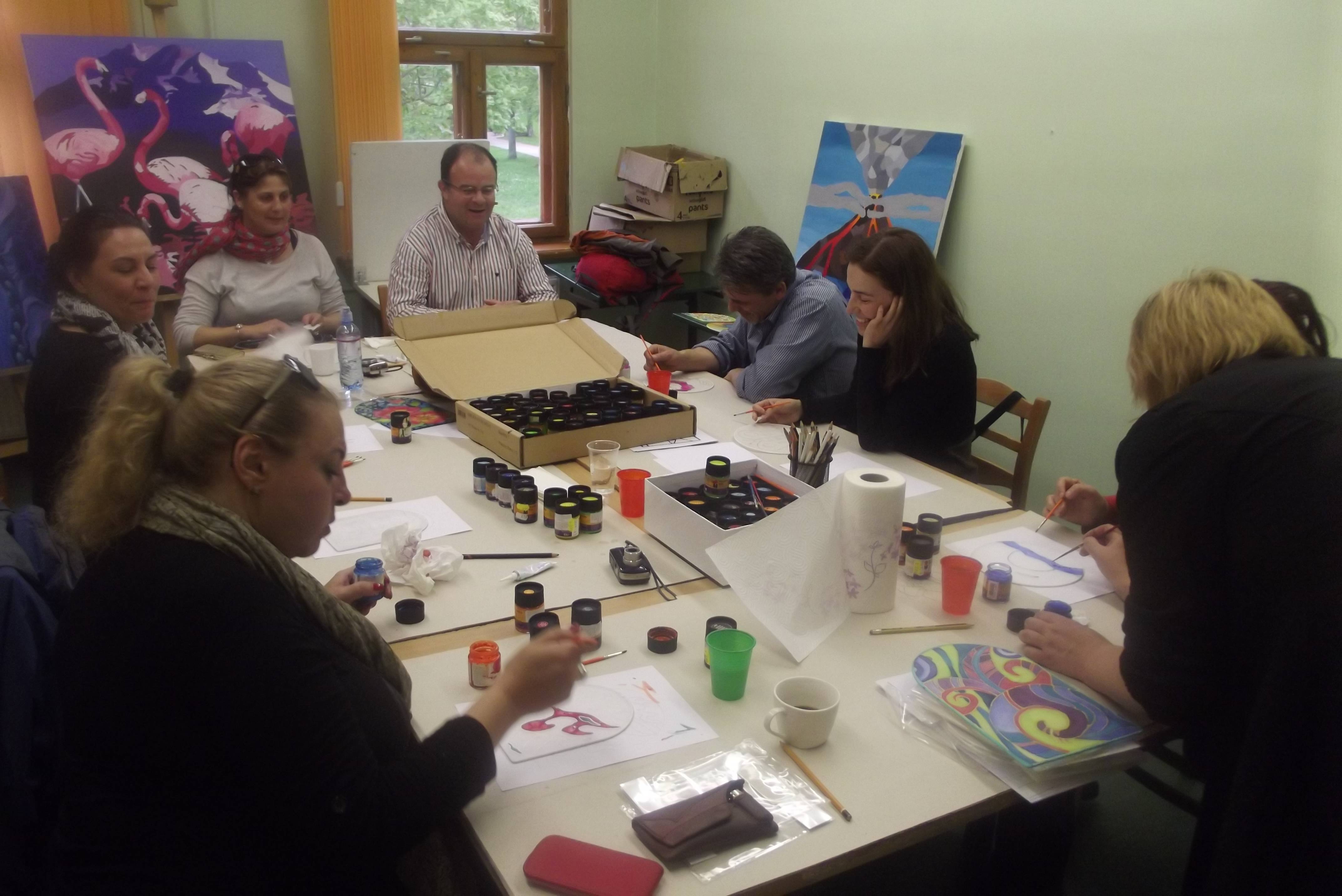 The Dobele art school was visited. Partners acquainted the school's history, activities and current events of art education. The meeting with art school teachers was organized. Greek guests participated in two workshops were the practical skills of silk painting and glass painting were tested.